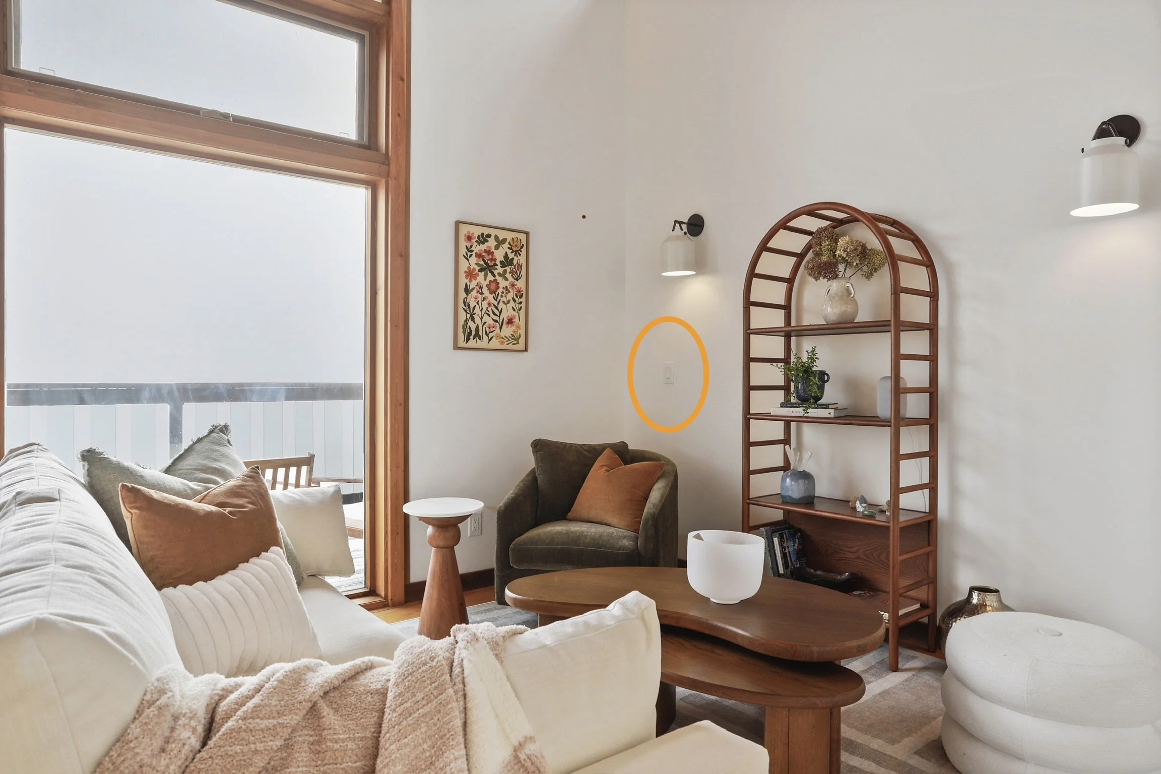 There’s a discreet wall switch tucked into the corner of the great room, just behind the green chair, that controls the backyard flood light. When the switch is turned on, the light operates on a motion sensor and will illuminate as movement is detected outdoors. When switched off, it will not activate at all, allowing the mountain to return to its natural darkness and uninterrupted starglow.